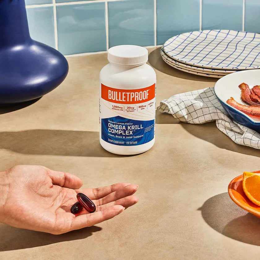 New Look, Same Great Product. Discover a better fish oil supplement with Omega Krill Complex. Its unique blend of wild-caught omega-3 krill oil and fish oil supports heart, brain and joint health. It's also fortified with astaxanthin and olive fruit extract for added antioxidants and GLA for omega-6 fatty acids. All these benefits are wrapped up in a convenient soft gel flavored with lemon. The result? A better fish oil supplement with less fishy flavor.†