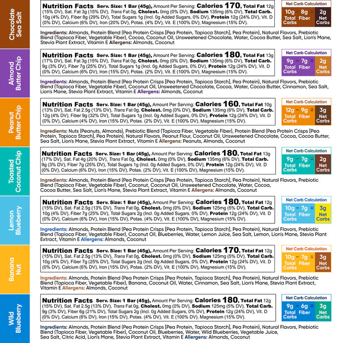 This pack includes 1 bar of all 7 of our flavors (Chocolate Sea Salt, Peanut Butter Chip, Almond Butter Chip, Toasted Coconut Chip, Lemon Blueberry, Banana Nut and Wild Blueberry).