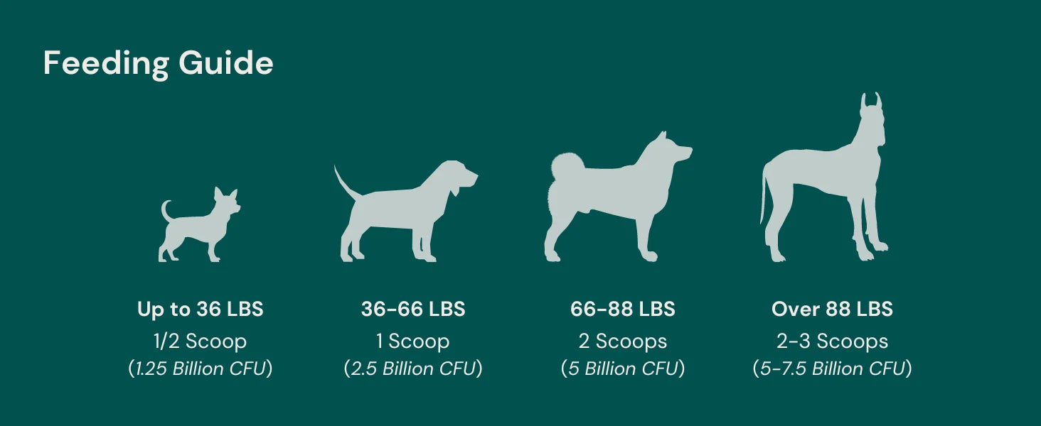 Animals over 88 lbs: 1x daily 2-3 scoops (= 5 to 7.5 Billion CFU)