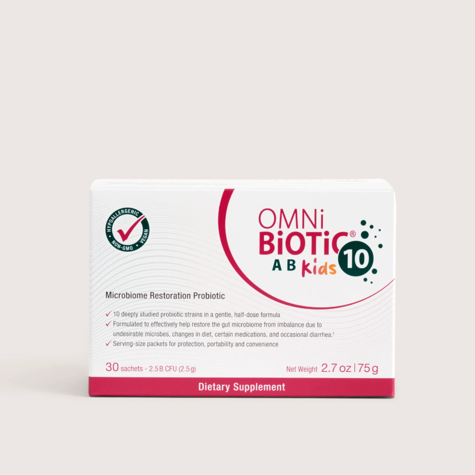 Omni-Biotic AB 10 Kids contains 2.5 billion CFU per serving / sachet.